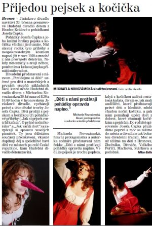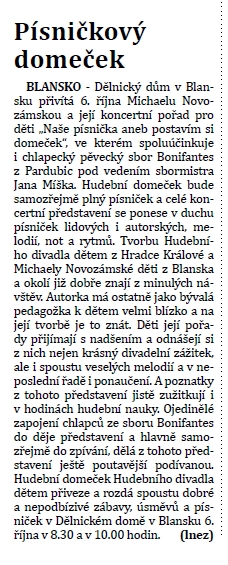 6. října 2016 v Blansku se uskuteční představení Hudebního divadla dětem " Naše písnička, aneb postavíme si domeček" s Michaelou novozámskou.
