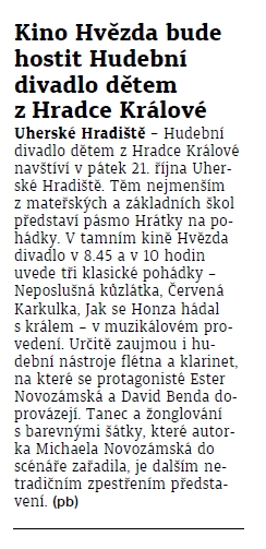Dne 21. října bude mít představení Hudební divadlo dtěem z Hradce Králové v kině Hvězda v Uherském Hradišti. Přivezou sebou klasické české pohádky zpracované do vystoupení " Hrátky na pohádky"