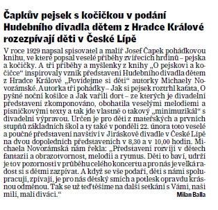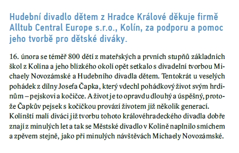 Tentokrát Hudební divadlo dětem přiveze do Kolína představení " Povídejme si". Tři minimuzikály na motivy Karla Čapka v podání zpěvačky a herečky Michaely Novozámské. Březen 2016