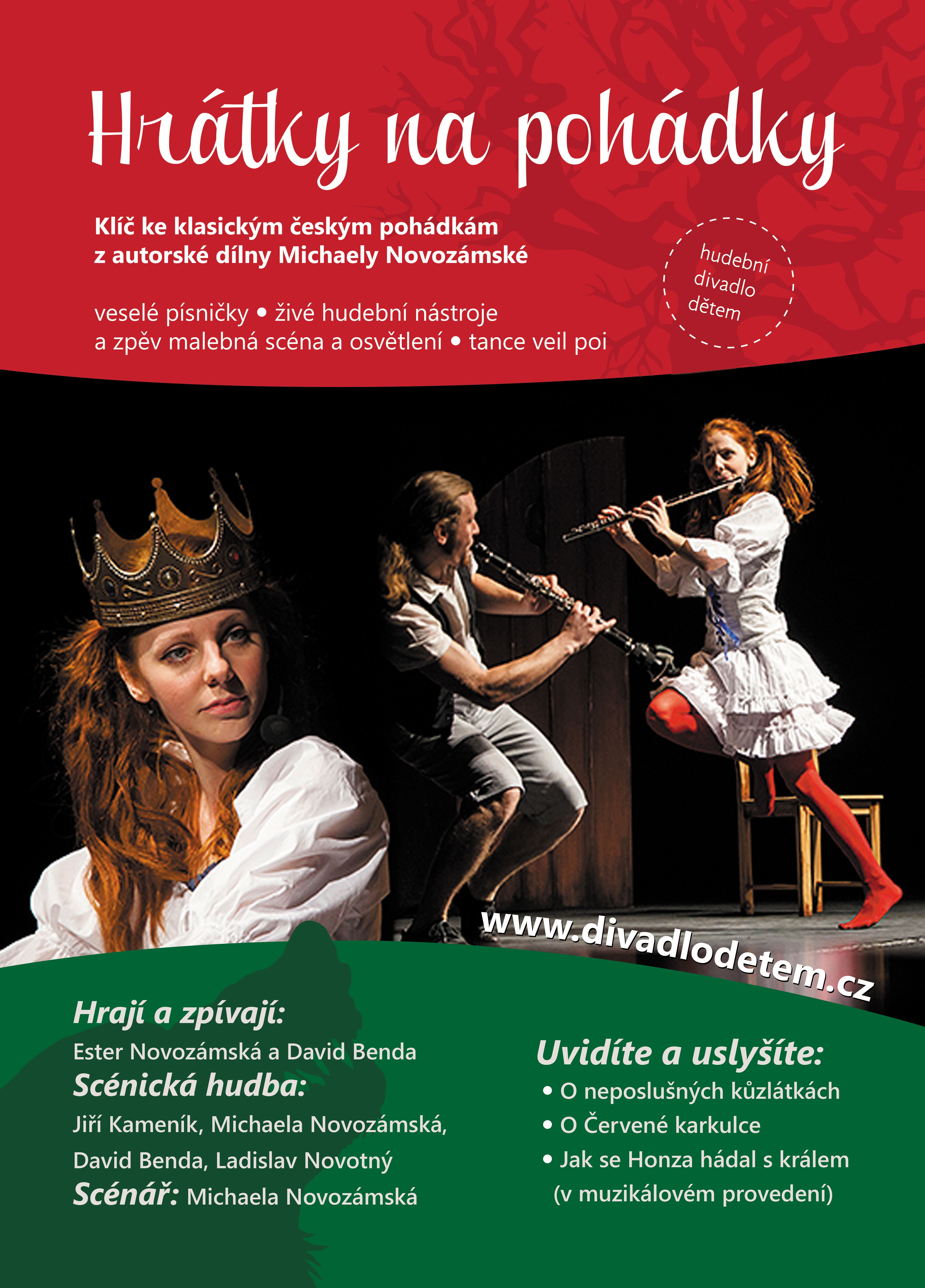 Nové hudební pohádky pro nejmenší děti mají název "Hrátky na pohádky". Kouzlo českého jazyka, klasické hudby i veselých autorských písniček učaruje malým i velkým divákům. Humor a lehkost provedení působí, že se divák ani na chvíli nenudí! Představení je vhodné pro děti od tří do deseti let. Náš druhý umělecký tým obohatil toto představení o skvělou hudební dovednost a také scénický tanec Poi poi.